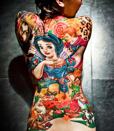 Annafaye, winner of this year’s Best Tattoo Award at Singapore’s annual convention. Her back depicts the whole set of characters from Disney’s Snow White. She says that it took three months to complete and the inspiration for the motive came to her in a dream.