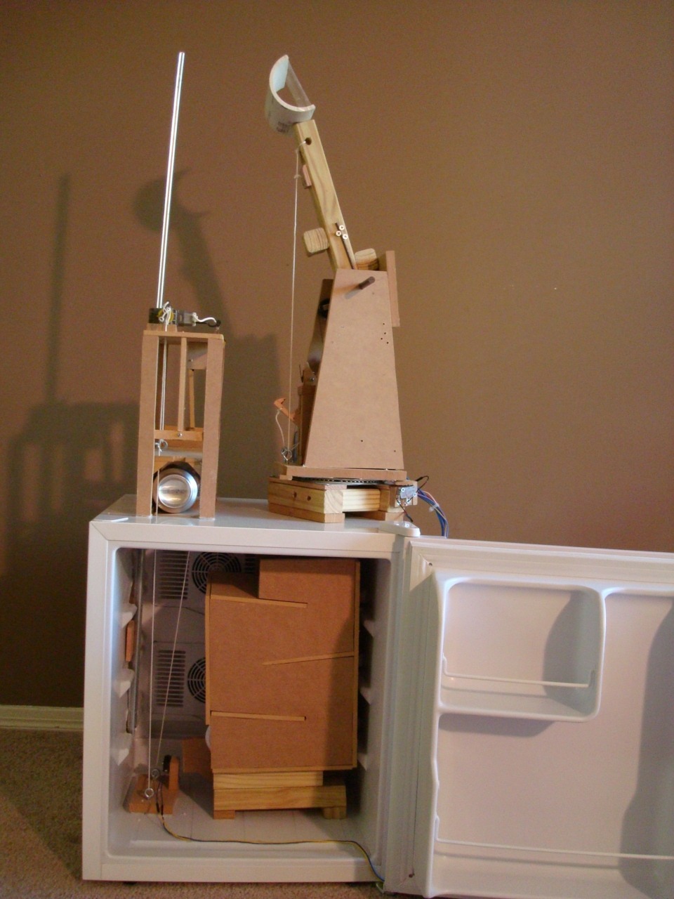 A working design by a Purdue student, it does exactly what the description states: takes a beer from the fridge and throw it across the room. The device can be activated by remote control. More photos and details of the design at the link above.