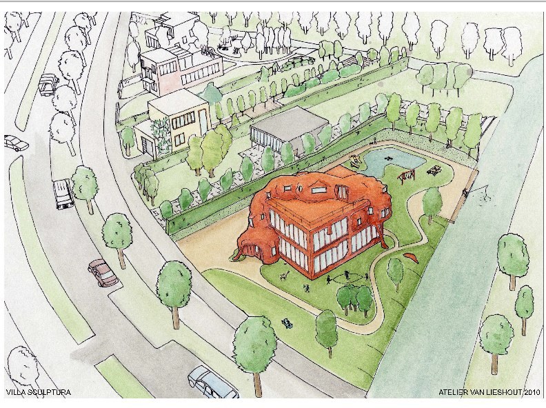 Villa Sculptura is a house for sale in The Netherlands, more precisely, a neighborhood in the city of Utrecht. For one million Euros you buy the land, the design of the house and the exterior customization so that your home can look like a tapeworm. Not included: construction of the house itself, materials to build the house, building permits, etc, etc.