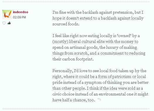 While I appreciate the goal of local areas becoming more self-sufficient with regards to food production, and the reduction of emissions due to moving food around unnecessarily, the sudden surge of the local food movement is a little short sighted. The most hilarious part about it is that, with demand for local food suddenly surging far beyond capacity to provide said food, to up production local farmers are now increasingly hiring cheap migrant labour so that upper middle class people can feel good about going to a farmer’s market to buy local food from a family farm. I’m not sure moving around some of the most unprotected peripheral workers instead of moving around food is much of an improvement.