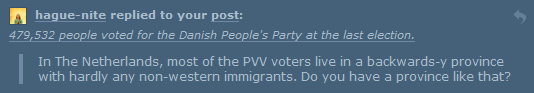 Ah, the workers thing is big with the perception of the PVV too. They stole a large part of their political program from the Socialist Party, actually. Literally lifted it from their program. Keeping the pension age at 65 (something they sold out on immediately), better care for the elderly, all that sort of stuff was the “social” side of their campaign. I guess it’s a standard part of European far-right parties. I mean, look at national-socialism in 1930’s Germany. They too proposed to help workers, curb unemployment, protect the family, all that jazz. And they paired it with xenophobia, like the PVV and DPP. Which is why the PVV program reads like something out of the “early national-socialism” chapter in my high school history book.