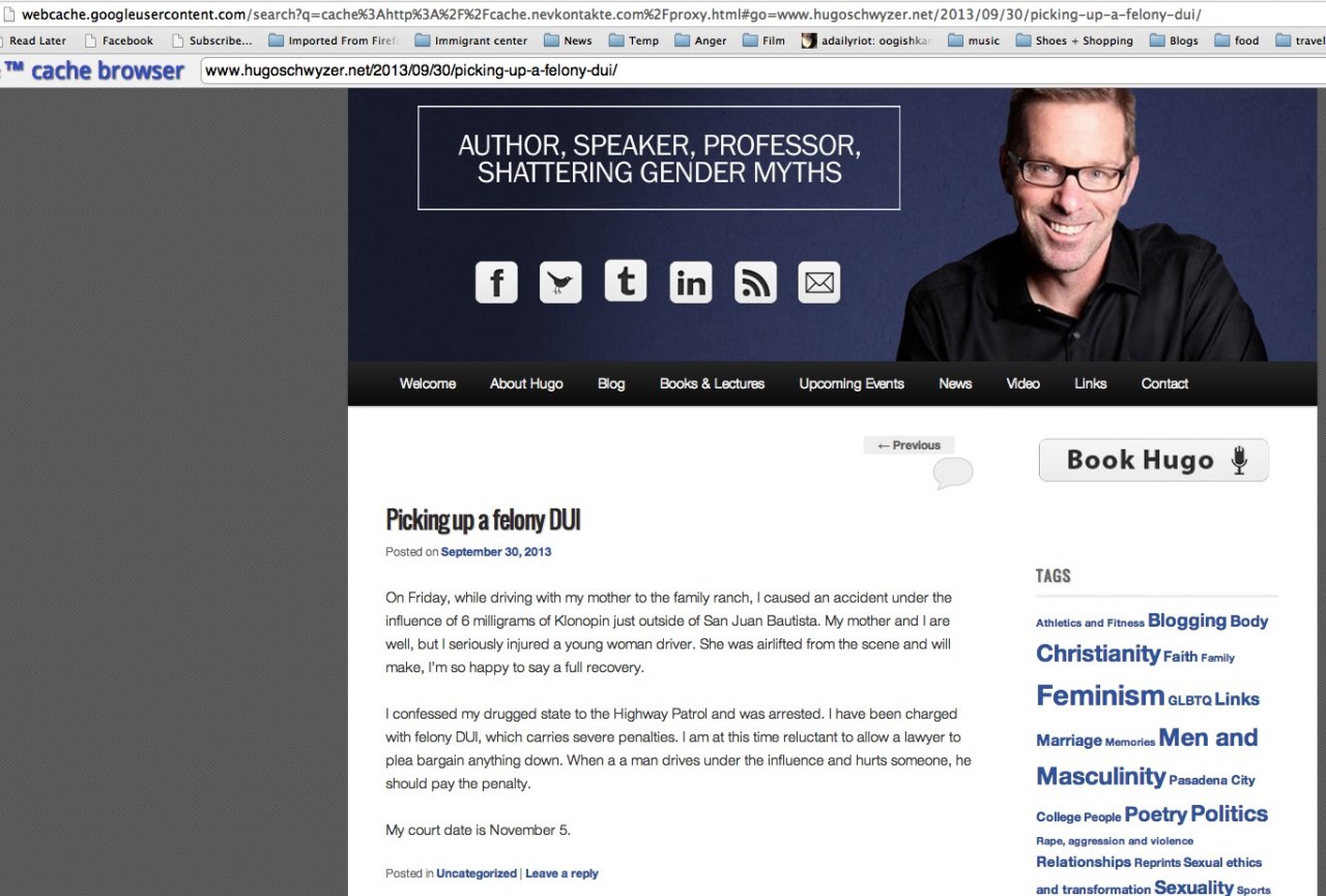 Hugo Schwyzer in DUI, victim severely injured, had to be airlifted.