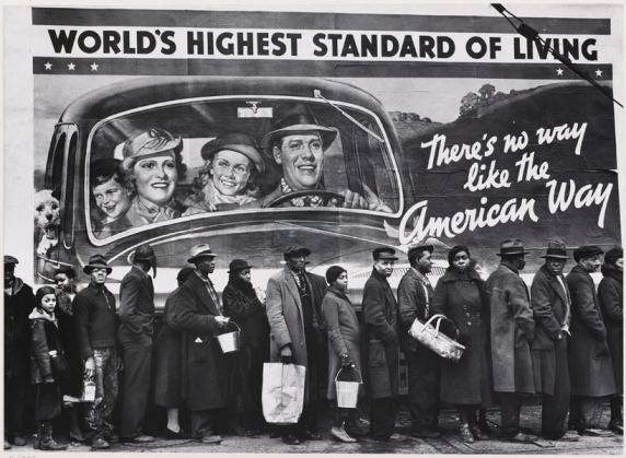 I am sure I am not the first one to notice but the look in the woman’s face does not seem exactly joyful or celebratory of this American Dream, but more like one of sheer terror. Maybe she caught a glimpse of the future?