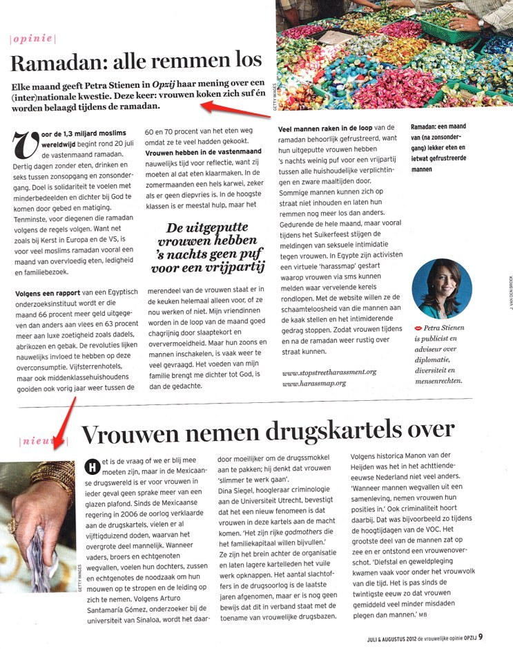 I scanned this page out of the summer edition of Dutch magazine OpZij. This is hands down, the most popular feminist magazine in the country. They devote two news items to Women of Color in this edition. Both are in this page. The top item explains how Muslim women “cook themselves silly and are attacked during Ramadan” and the second one, with the disembodied brown, Mexican hand illustrating the item, is about women who participate in drug cartels.