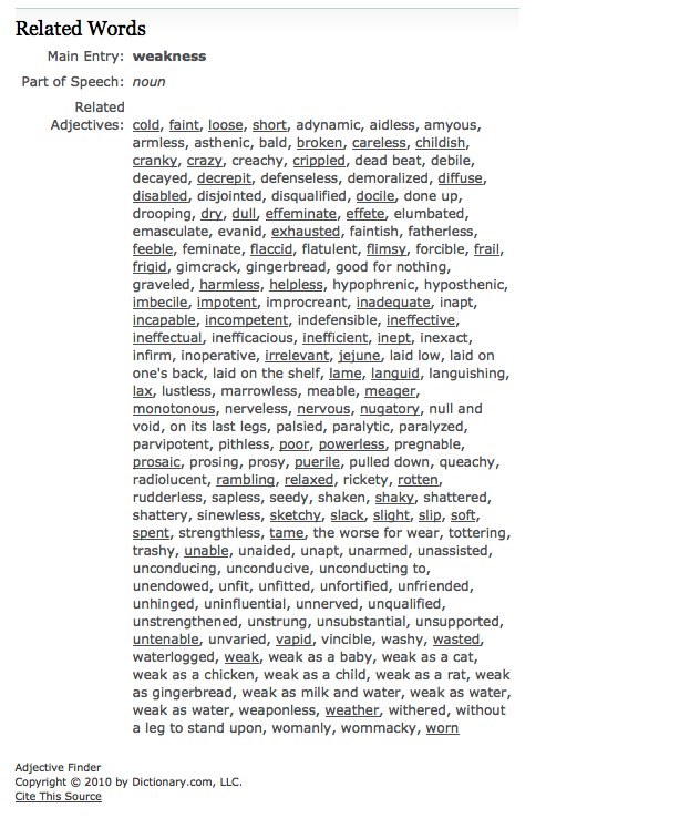 I wish I was making this shit up. After seeing that “power” = male and masculine in the world of Thesaurus.com, I checked their definition of weakness. And here it is: weakness = effeminate and womanly.
