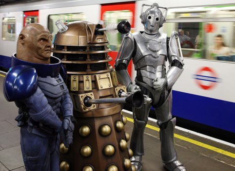 A sontaran, cyberman and dalek just casually standing in the underground.