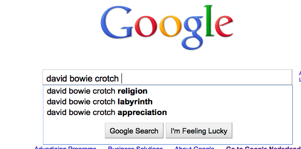 In view of the Bowie’s crotch on Labyrinth post showing on my dash today, I thought to check what other people might be saying on the subject (don’t ask, the workings of my feeble mind should remain mysterious) and this is what Google suggested. “Religion” and “appreciation” for the Bowie crotch.