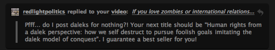 So I went over to Wikipedia, read the first two paragraphs, and learned a good deal more than I needed to know. And I don’t say that because I’m some sort of SciFi snob. No, I say it entirely from an academic perspective. That is, my sense is that a book that tries to combine human rights and these mechanical mutants would involve series headaches for the author … in no small part because a) the daleks aren’t human themselves and b) the daleks seem more interested in doing terrible things to humans than in thinking about rights and dignity.