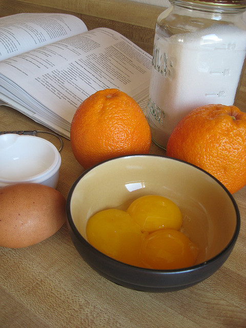 [Image: Raw ingredients for blood orange curd (eggs, blood oranges, sugar) assembled next to a copy of the Joy of Cooking.]