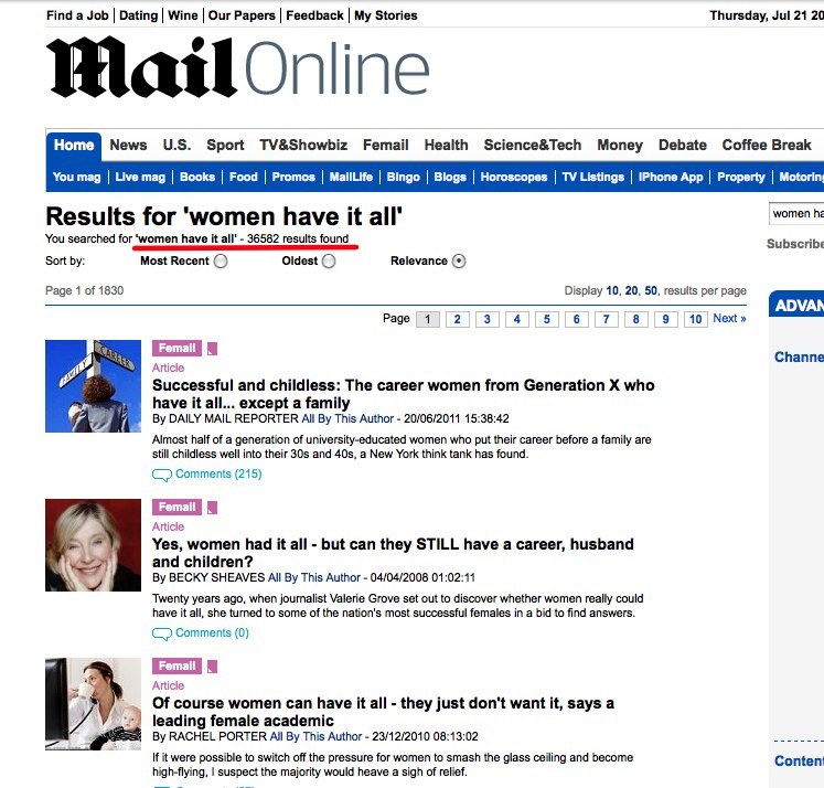 Misogyny Watch just brought this to my attention on Twitter. A search of “Women have it all” on the Daily Mail produces more than 36 thousand results. This goes to prove that the tabloid doesn’t have a gender related agenda to push, not at all. Here’s the link to the search, in case you’d like to pursue the enticing headlines.
