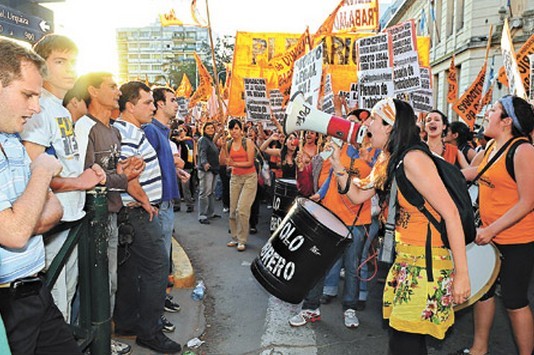 Every year, without fault, the Catholic Church sends requests for their most active and rancid groups of men to stand on the way of these marches and stop them through whatever means are necessary. This photo above, taken during the closing march of 2010 is an illustration of their tactics. Usually the men scream abuse at the women and, in some cases, get physically violent with them. During the 2010 event, the local Bishop held a mass to “exorcise the evil from the feminists that were claiming for abortion rights” (cache of the post in Spanish because original link seems to be broken).