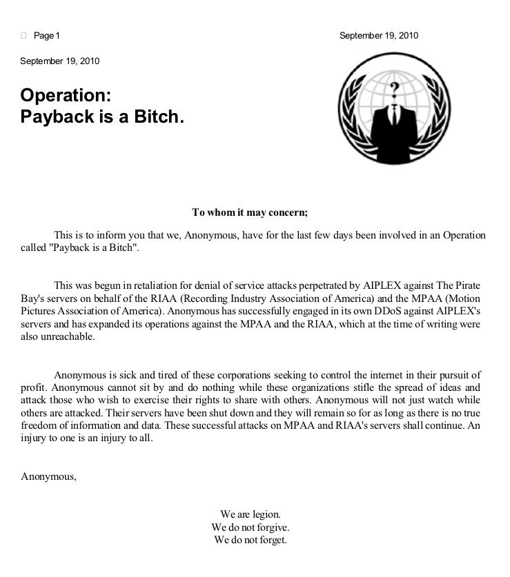 The letterhead alone cracks me up. They had this to say about the launched attack: “We target the bastard group that has thus far led this charge against our websites, like The Pirate Bay. We target MPAA.ORG! The IP is designated at "216.20.162.10″, and our firing time remains THE SAME. All details are just as before, but we have reaimed our crosshairs on this much larger target. We have the manpower, we have the botnets, it’s time we do to them what they keep doing to us”.