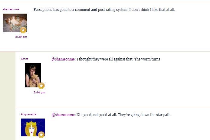 Persephone is trying a comment rating system because several members requested it. Persephone doesn’t even know what a star path is, and certainly isn’t going down it if there are worms on it.
