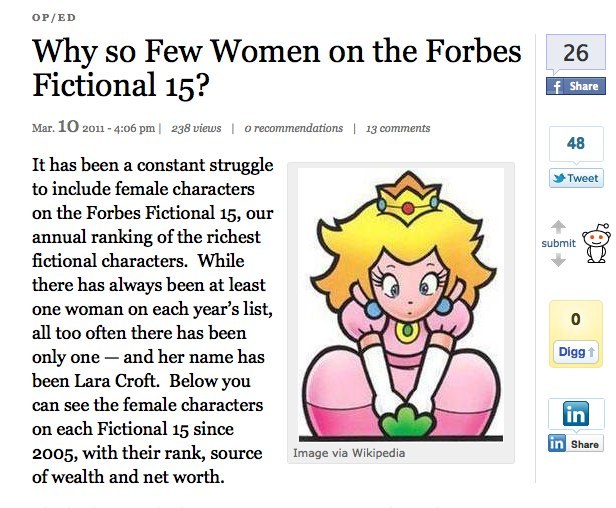 Related to my last post about Forbes Rich List, it seems that the gender gap now also extends to fictional characters. More at Forbes.