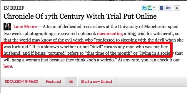 Say what you will about Jezebel, but we have to admit the EIC has a special talent. She is one of the few people I know of, in mass media who can bring a new person on board and ensure that this new employee will continue the tradition that defines her reign: trivialization and inanity. In this case, of torture and death of what was, arguably, the first documented mass femicide in history. Because we know that the Inquisition and menstruation are totally the same thing.