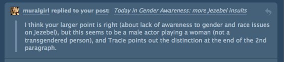 She could have used the opportunity to bring up issues of gender and representations but instead, her post is “HAR HAR HAR A man is playing the part”. Sure, it’s the Real Housewives franchise, something pretty inane already. But instead, she deliberately posts a photo of a female gendered person and goes on about “it’s a GUY!”. Is it? Even if the person is using a female name, dressed in female clothes, etc. Then perhaps the issue could have been framed not by saying that “a man” (who for all intents and purposes looks like a woman) is playing a “woman” (i.e. pretending to be something he is not) but by pointing that they have hired actors to play roles, etc. However, because this is Tracie, there is no nuance and no sensitivity.
