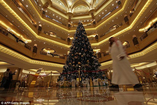 Dubbed one of the ‘most expensive Christmas trees ever’, the glitzy Emirates Palace hotel has unveiled the 40ft evergreen in its gold-leaf bedecked atrium.