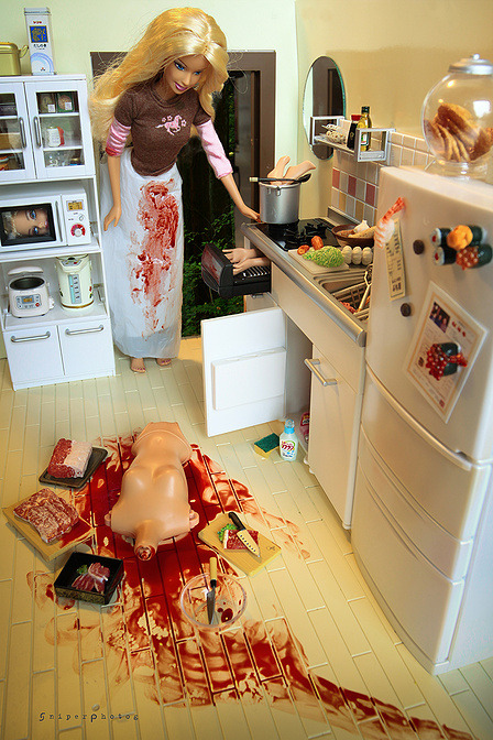 Photographer Mariel Clayton creates gory art with Barbies. Her dolls carry heavy weapons, knives and are set on causing mayhem. Her photos are detailed and evoke an atmosphere that is both creepy and cheerful at the same time. Check her work at the link.