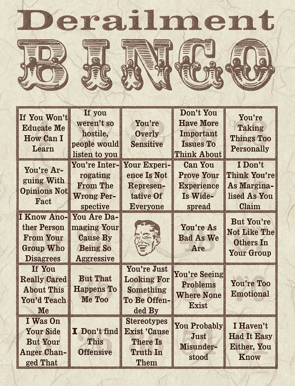 Derailment Bingo by piranha @ Dreamwidth (http://piranha.dreamwidth.org/445505.html)