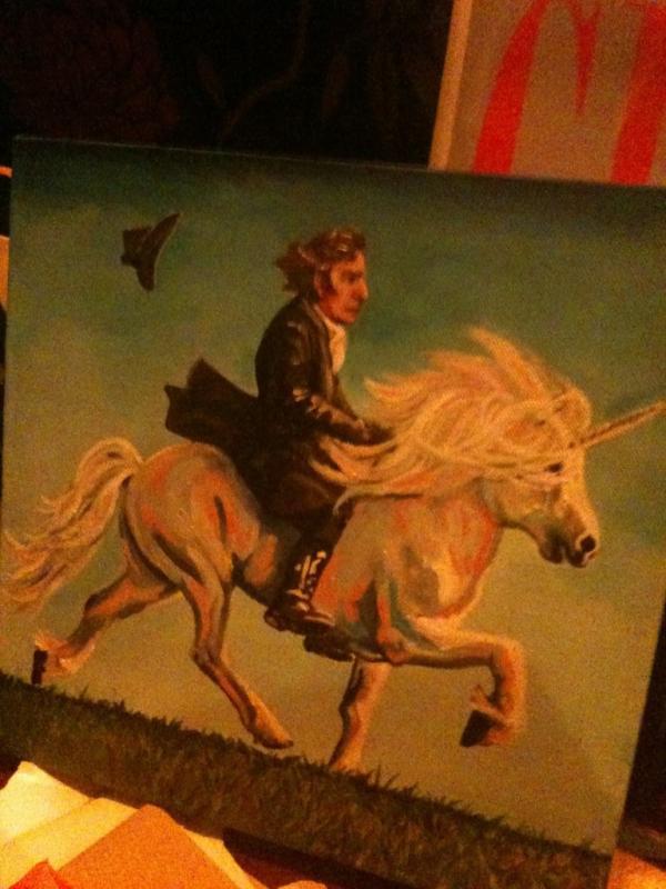 This is an oil painting of Alan Rickman, in his Sense and Sensibility costume, riding a unicorn. I need this in my life.