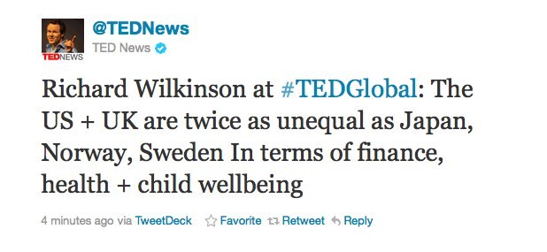 Now, let me be clear: I do not hate TED (and, as anyone who reads me on a semi regular basis knows, I reserve such emotion for very selected issues, mostly based on ideologies or rhetoric more than individuals or organizations). Moreover, I have enjoyed some TED talks. However, Tweets like the above baffle me and amuse me on equal levels. Here’s the thing: TED is based on a principle of exclusion and well, inequality. The entire organization thrives on making their events as exclusive as possible (so much so that they have devoted an entire section of their website to answer the question “Is TED elitist?”). Entrance fee for the Global TED event runs at thousands of dollars (and they kinda pat themselves in the back because it is not as expensive as attending Davos). Their local TED events (like TEDxAmsterdam) are free to attend but guest lists are carefully filtered through so that only those who are deemed worthy can attend (or those few who win tickets in competitions that are always part of marketing schemes to further spread their brand).