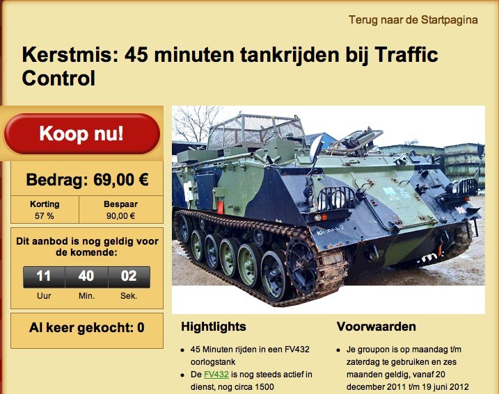 Today’s Groupon Christmas Special for The Netherlands, for the fanatic who has everything: ride a war tank for 45 minutes. And yes, it is being promoted as a “Christmas Special”. Because nothing says peace on Earth like driving a tank.