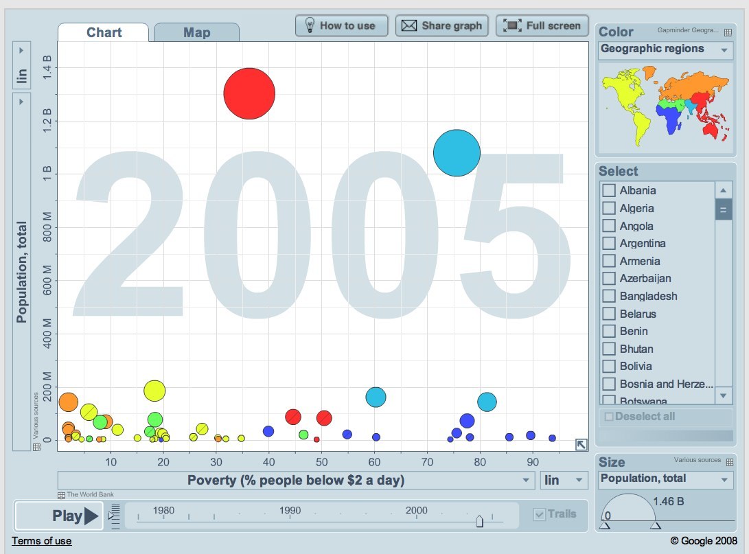 Gapminder is a non-profit venture – a modern “museum” on the Internet – promoting sustainable global development and achievement of the United Nations Millennium Development Goals.