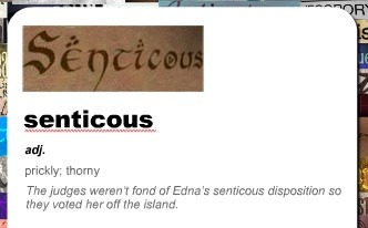 You may have seen a link in your dashboard to Save the Words, a site from Oxford Dictionaries dedicated to the preservation and revitalization of English words in danger of fading entirely from the language. I clicked over and began searching for a word to adopt, and as soon as I read the descriptive sentence for senticious (adj.: prickly; thorny), I knew my word had found me: The judges weren’t fond of Edna’s senticious disposition, so they voted her off the island. One of my internet sheroes goes by Edna, so in her honor, I promise to use my word as often as possible, even if I must conduct myself senticiously in order to do so.