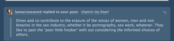 Very good points. And in this, I have come to the realization that most of these organizations share the same pattern: cis women, more often than not economically privileged, with very little (if any at all) first hand knowledge of the realities of sex work and with a very strong, quasi religious tone in their moral paradigms.
