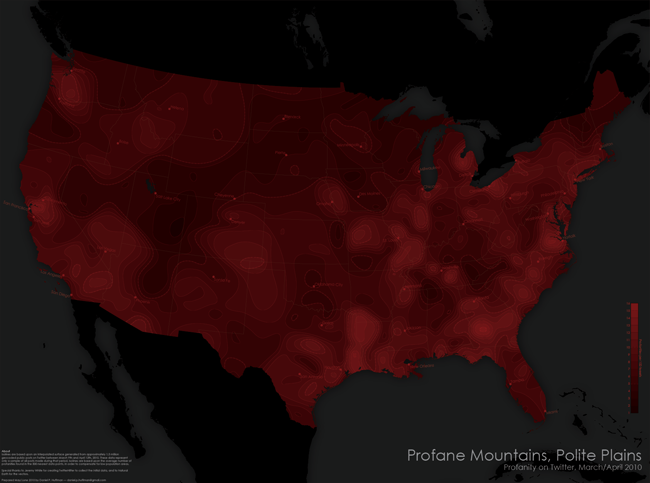 Based upon an interpolated surface generated from approximately 1.5 million geocoded public posts on Twitter between March 9th and April 12th, 2010. These data represent only a sample of all posts made during that period. Isolines are based upon the average number of profanities found in the 500 nearest data points, in order to compensate for low population areas.