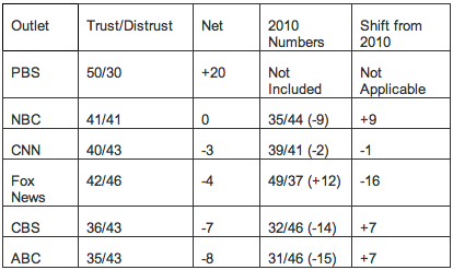 via Daily Kos, a snapshot of US news organizations, PBS most trusted name, Fox most distrusted. More analysis at the link.