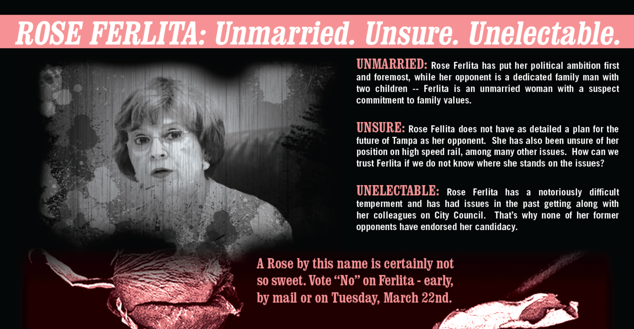 In yet another attack on a woman politician on the basis of her gender, a mailer urges voters to not elect Rose Ferlita on the grounds that she is not married.