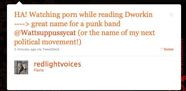 (I know this is my own Twitter, but whatever). This is going to be my feminist manifesto from now on. If someone asks me which wave I am, which type of feminist, etc, my answer will be “I watch porn while reading Dworkin”.