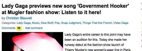 She has already offended minorities and LGBTQA folks with Born this way. Now, “Government Hooker”? Someone reminds me of Kei$ha’s faux controversies a bit too much. Headline courtesy of EW.