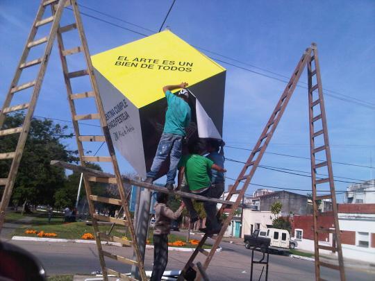 Workers putting up a poster with the words ’el arte es un bien de todos’ (art is a common wealth that belongs to everyone) in Resistencia, Chaco, Argentina. (via Documenta).