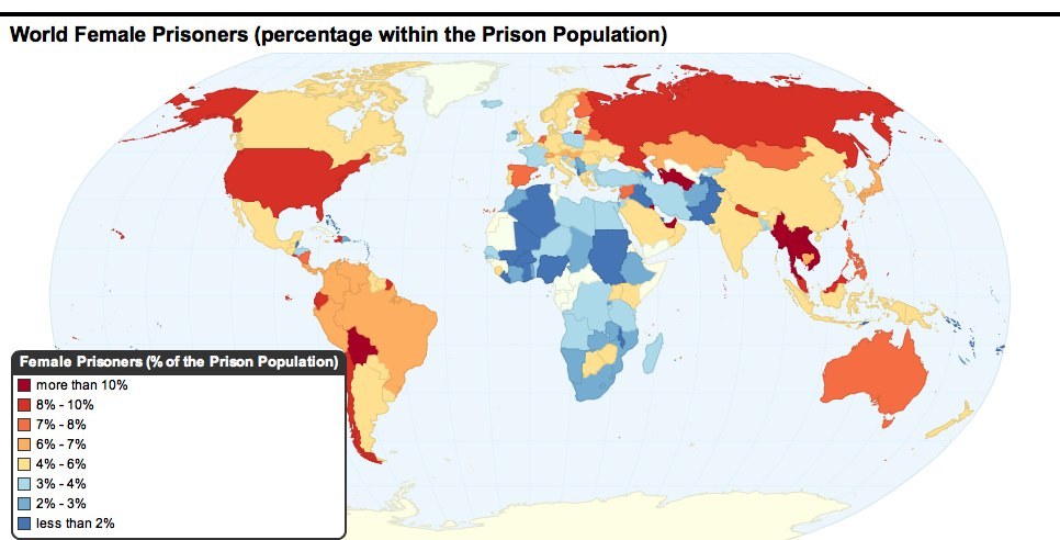 via Chartsbin. This map shows the percentage of female prisoners within each national prison population. Female prisoners includes women and girls held in penal institutions, as pre-trial detainees (remand prisoners) or having been convicted and sentenced, in the world