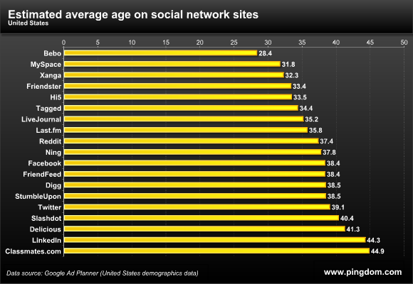 Brian Solis did some data crunching on The Age of Social Networks, analyzing the demographics of 19 different social media sites and surprisingly, what came up is not what most of us would have imagined. Two examples (I am just picking the two most popular ones, the complete list, with more graphics and commentary at the link above):